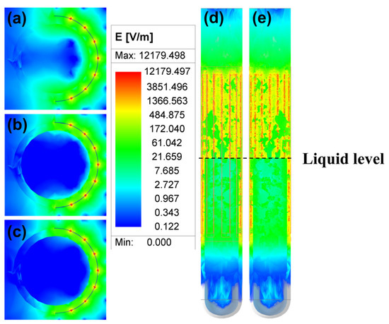 Electrical field distribution of the sensor in the glass tube with water (a) from a cross-sectional (liquid level above 1 mm) perspective; (b) from a cross-sectional (liquid level) perspective; (c) from a cross-sectional (liquid level below 1 mm) perspective; (d) from a frontal perspective; (e) from behind.