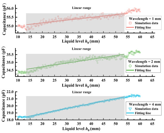 Capacitance values in the form of simulation point data and a fitting line with respect to the liquid level for three kinds of IDT wavelength (1 mm, 2 mm, and 4 mm).