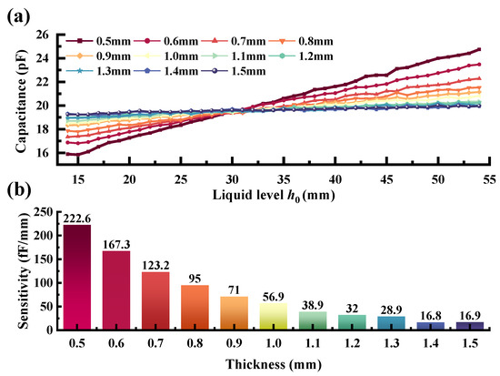 (a) Simulation capacitance with respect to liquid level for different thicknesses of the test tube; (b) sensitivity.