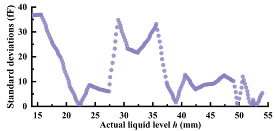 Figure 15 presents a comparison between the measured liquid level, converted according to Equation (11), and the actual liquid level, accompanied by an analysis of the errors between the two. The standard deviations of the calibration curve comparing the experimental data are shown in Figure 16.