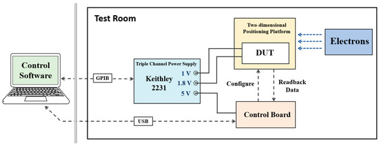 Based on the characteristics of SRAM-based FPGA devices, the SEE test system is shown in Figure 2. The test system included a triple-channel power supply, control board, DUT, and computer. The Keithley 2231 SourceMeter was selected as the three-channel power supply to supply power to the SEE test system, providing 5 V voltage for the control board and 1 V and 1.8 V voltage for the test board. This was controlled remotely by the laptop over a GPIB line. The control board was used to communicate with the computer, including sending and receiving test data. The DUT was connected to the control board to realize configuration and data reading functions. The SEE test system can detect both SEFI and SEU.