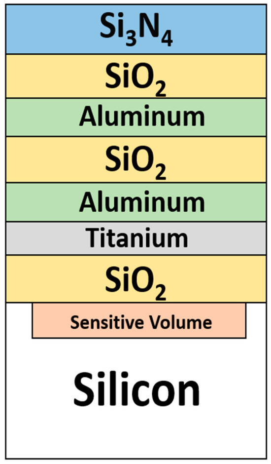 Through the Geant4 [17,18], ionization energy loss (IEL) and non-ionization energy loss (NIEL) in the fundamental MOSFET structure of the POR register under electron irradiation with different energies were obtained [19]. The geometric structure in Geant4 simulation is shown in Figure 3.