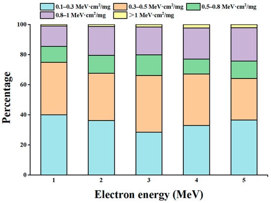 The LET distribution produced by different electron energy is shown in Figure 4. When the electron energy is 3 MeV, the LET distribution has the highest probability in the range of higher than 0.3 MeV·cm2/mg, which is 71.4%.
