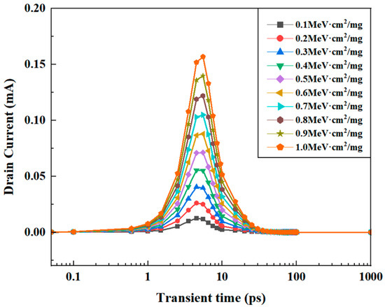 To investigate the influence of SEE on the device, we simulated the SEE-induced transient current in the TCAD model of the device. We defined the particle type, and the particles were vertically incident on the drain and passed through the device with a track radius of 0.02 μm. Since the distribution has the highest probability in the range of 0.1~1 MeV∙cm2/mg derived from Geant4 simulation above, the particle-induced single-event transient currents under this LET range were simulated via the TCAD model. As shown in Figure 6, the transient currents occur within a period of several tens of picoseconds, and the amplitude increases with the increase in the LET value.