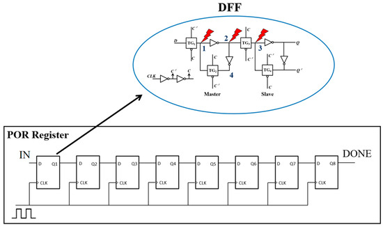 In order to further explore the influence of SEE, the equivalent circuit of the POR register was established utilizing the SPICE model. Whether SEFI has occurred in the POR register can be judged by the DONE port signal state in the POR register. If the DONE signal voltage is low, it is determined that SEFI has occurred. The sequential diagram of the DONE signal state can be obtained from the Xilinx overview [24], and the DONE signal state changes from “0” to “1” after eight clock periods to realize the configuration function. According to previous studies [25,26], the equivalent POR register structure including eight D flip-flops was built, which can implement the DONE sequential function (Figure 7). The configuration function of the POR register was simulated when there is no fault injected to the circuit, and sequential function of the POR register was simulated to check whether SEFI occurred when there is a fault injected into the circuit.