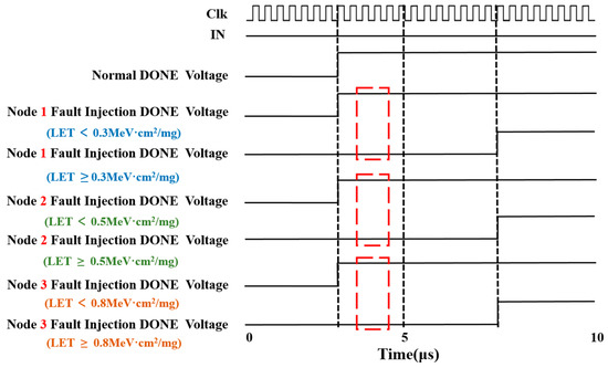The SEE-induced transient currents for different LET values (Figure 6) were injected into circuit nodes 1, 2, and 3 of the POR register (Figure 7) as fault, respectively. The critical LET values of SEFI were determined according to the DONE port signal state in the POR register. The simulation results of fault injection into different nodes are shown in Figure 8. When no fault is injected into the circuit, the DONE state transitions from low to high after eight clock periods, achieving the normal configuration function (Normal DONE Voltage in Figure 8). However, when the faults with different LET values and a duration of 5 μs are injected into each node separately, the DONE state transition may not happen, indicating the existence of SEFI. The LET thresholds that cause SEFI for different fault injection nodes were simulated by increasing LET with a step of 0.1 MeV·cm2/mg. When LET value increases to the threshold, the DONE state cannot transition from “0” to “1” within 5 μs, marked as red boxes in Figure 8, and returns to normal function after the fault duration of 5 μs. It is found that when a single-event transient current is injected into nodes 1, 2, and 3, the LET thresholds for SEFI are 0.3 MeV·cm2/mg, 0.5 MeV·cm2/mg, and 0.8 MeV·cm2/mg, respectively, as shown in Figure 8. Since node 1 has the lowest LET threshold for SEFI, this node is the most sensitive location for single-event soft errors in the device.