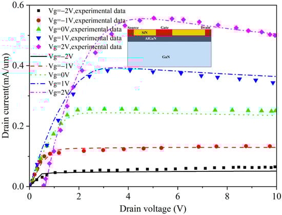 To verify the correctness of the simulation method and process, a typical GaN HEMT device model from [31] was built to simulate drain current characteristics, as shown in Figure 1. In order to keep up with actual test results, trap models and self heating effects were introduced. The simulation results are consistent with the test results in [31], which proves the correctness of our simulation method and process. Figure 1 shows that the drain current increases with the drain voltage, and when the voltage increases to a certain value, the current decreases due to the self-heating effect. Due to the presence of self-heating effects, small oscillating currents may be obscured, while there is the same trend under other gate voltages. With the increase of gate voltage, the peak drain current also increases correspondingly, and the self-heating effect gradually becomes obvious. By changing the gate voltage in HEMT devices, the depth of the potential well in the AlGaN/GaN heterojunction can be changed, and the concentration of two-dimensional electron gas in the channel can be directly controlled, achieving the “on” and “off” changes of the conductive channel. Ref. [32] reports that when the lattice temperature increase in the device is taken into account, the oscillation current appears lower and its amplitude is also smaller due to a degradation of the transport properties. When considering the thermal effect, the oscillation period is slightly longer due to a higher transit time in the device. To analyze better and more clearly the Gunn oscillation effect, self-heating effects are disregarded in the subsequent simulations.