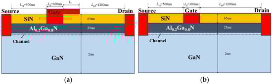 GaN HEMT structural model: (a) field plate HEMT; (b) conventional HEMT.