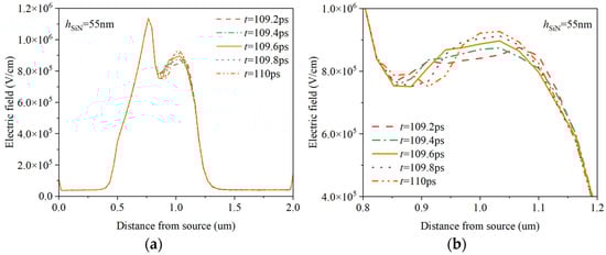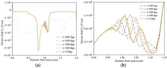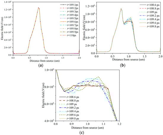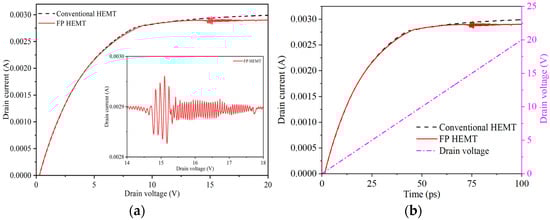To investigate the modulation effect of the field plate on the channel electric field of the HEMT device, the channel electric field distribution is recorded as in Figure 4. Here, the applied gate voltage is set to 2 V, the drain voltage is set to 16 V, and the field plate length of the field plate HEMT is set to 300 nm. The time interval of extracting the channel electric field distribution is 0.1 ps. It is found in Figure 4a that the peak electric field intensity of conventional GaN HEMT is as high as 1.28 × 106 V/cm. It can be seen in Figure 4b that when the length of the gate field plate Lr is 300 nm, the peak electric field intensity of the gate near the drain end is 1.15 × 106 V/cm. In Figure 4a, except for the strong electric field in the channel region corresponding to the gate electrode, the electric field intensity in other regions of the channel is very low, and the distribution is also very uniform. When a bias voltage is applied to the drain, a peak electric field is generated near the drain edge under the gate, but it is too narrow to satisfy the conditions for domain formation due to the short drift time. The electric field distribution remains unchanged. Therefore, for conventional HEMT devices, the I–V characteristic curve shows a relatively smooth curve form, and no current oscillation phenomenon is observed, as shown in Figure 3. Due to the connection between the field plate and the gate, the field plate has a potential similar to that of the gate, which can modulate the local electric field under the gate. In Figure 4b, the field plate weakens the peak of the peak electric field below the gate, and introduces a new peak electric field at the channel below the edge of the field plate. The introduction of a new peak electric field broadens the high electric field region in the channel of the HEMT device, making the area that can enter the NDM region more extensive, and electrons can accumulate to form electron domains. The length of the negative differential mobility region is sufficient for the electron domains to grow and mature until the domain drift reaches a steep drop in field strength after the second peak value, and the domains are depleted rapidly. This is the termination region of the Gunn domain for this device, and the dual-field peak structure of the field plate (FP) HEMT can induce spatial charge disturbances at each peak, potentially serving as nucleation zones for the electron domains. The oscillation mode of multi-domain oscillations at dual nucleation points can significantly enhance the oscillation frequency of the current. Moreover, by varying the gate bias, the two peaks can be controlled to be within or outside the negative differential mobility (NDM) region, thus regulating the number of nucleation points and altering the oscillation frequency. Under the same applied voltage, the peak value of the channel electric field at the gate edge of the HEMT with the field plate decreases, and a second peak appears near the drain electrode at the edge of the field plate, increasing the coverage area of the electric field curve. The results are consistent with those of [33]. In addition, the depletion layer is formed in the AlGaN barrier layer by the field plate, which alleviates the bending degree of the depletion layer at the gate edge and reduces the peak electric field at the gate edge, thus affecting the distribution of the channel electron density.