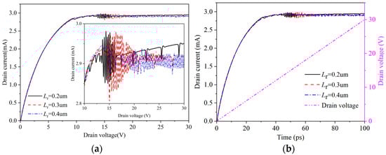 Drain current at different Lr. (a) Curve of drain current variation with drain voltage; (b) drain current and voltage curve with time.