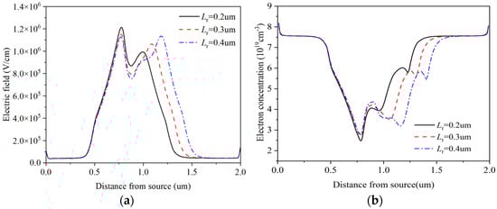 Electric field and electron concentration distribution at the channel: (a) Channel electric field distribution; (b) electron concentration distribution at different Lr.