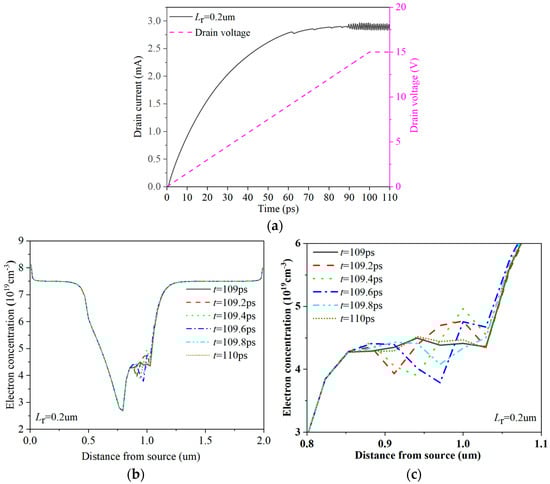 Distributions of channel electron concentration at different times at Lr = 0.2 um. (a) The I−t curve and the voltage corresponding to the time; (b) channel electron concentration distribution at different times; (c) local distribution map of channel electron concentration at different times.