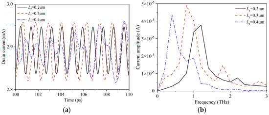 The structure parameters of field plate HEMT devices remain unchanged, and the influence of changing the field plate length Lr on the Gunn oscillation effect is considered. The resulting drain current is described in Figure 5. Here, the gate applied voltage is set to 2 V, and the range of the drain voltage is set to 0~30 V. It can be seen from Figure 5 that within a certain range, with the increase of the Lr, the drain voltage range can make the current oscillation increase. Figure 6 shows electric field and electron concentration distributions at the channel of the GaN HEMT with different field plate lengths at 100 ps. At the position of 0.7 um, corresponding to the edge position of gate electrode near the leakage electrode of the GaN HEMT device, the channel electric field intensity decreases rapidly under the action of the gate field plate. The distribution of electric field along the channel direction also varies significantly depending on the length of the gate field plate. With the increase of gate field plate length Lr, the peak value of the secondary electric field increases gradually, but the peak and valley of the channel electric field near the edge of the gate electrode decrease continuously. In addition, the positions of electron domains generated in the channel are also different. This is because different gate field plate structures have different regulatory effects on the channel electric field. This further widens the high electric field region where the device can enter the negative differential mobility region, extending the length of the region where electron accumulation can occur, leading to an increase in the crossing distance of the electron domains. To illustrate the position of electron domain formation, the distributions of channel electron concentration at different times at Lr = 0.2 um are described in Figure 7 which shows the obvious resonance phenomenon under the Lr = 0.2 um field plate. Therefore, the distribution of electrons along the channel direction corresponds to the distribution of the electric field. Figure 8a illustrates the evolution of drain current under the application of drain voltage capable of generating a stable oscillating current in devices of different field plate lengths. Figure 8b shows the frequency characteristics of drain current after FFT transformation. As the length of the gate field plate Lr increases, the length of the transit region increases and the fundamental frequency and second harmonic frequency generated by the device continuously decrease. The increase in the length of the gate field plate will lead to an increase in the parasitic capacitance Cgs and Cgd of GaN HEMT devices, ultimately resulting in a weakening of the frequency characteristics. However, it is also not possible to use a gate field plate structure that is too short for regulation. This is because a short field plate forms a narrow region of high electric field in the channel, and it is too narrow to form electron domains.