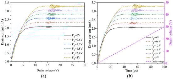 Drain current characteristics under different gate voltages. (a) Curve of drain current variation with drain voltage; (b) drain current and voltage curve with time.