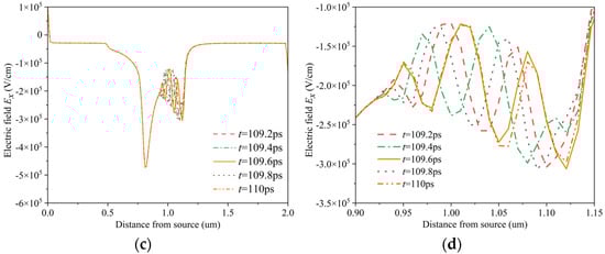 Transient distribution of channel electric field under different gate voltages Vg: (a) Vg = 0 V; (b) partial enlarged view of (a); (c) Vg = 0.75 V; (d) partial enlarged view of (c).