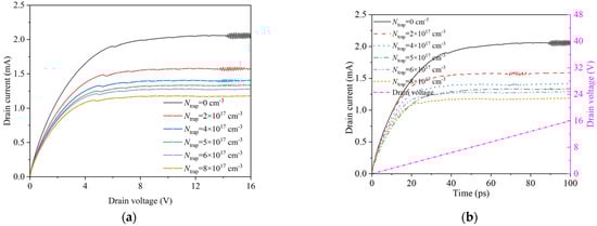 Output current at different trap concentrations. (a) Curve of drain current variation with drain voltage; (b) Drain current and voltage curve with time.