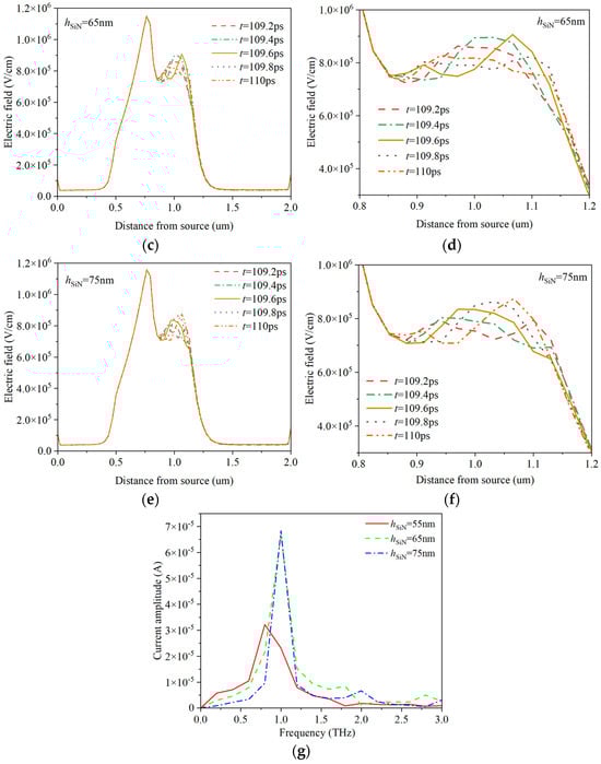 Figure 14 describes the electric field distribution in the channels of HEMT devices and the current frequency characteristics under different SiN passivation layer thicknesses hSiN. For the current frequency characteristics, the current values come from drain current values within the time period of 109 ps–110 ps in Figure 13. It can be seen from the figure that the modulation ability of the field plate on the channel electric field distribution weakens with the increase of the passivation layer hSiN. The peak electric field near the edge of the drain side of the channel below the field plate decreases, the electron domain becomes smaller, and the transition distance of the electron domain decreases. For Figure 14g, it is obvious that increasing the thickness of the passivation layer within a certain range can increase the frequency and amplitude of the current oscillation, but this increase becomes relatively weak when reaching a certain value. Because the thickness of the passivation layer will affect the modulation ability of the field plate, it is important to choose a reasonable thickness.
