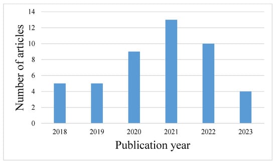 The search was restricted to include literature about path planning techniques for multi-robot systems that were published between 2018 and 2023. The applied search protocol resulted in the inclusion of 46 annually distributed articles, as Figure 2 shows.