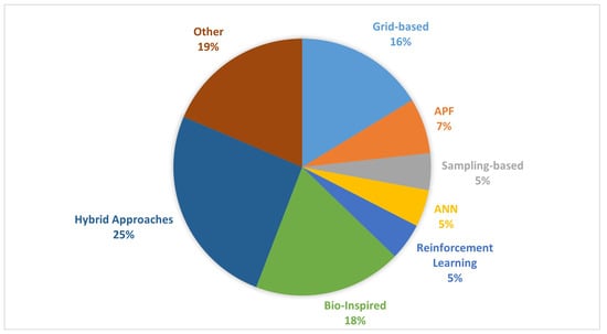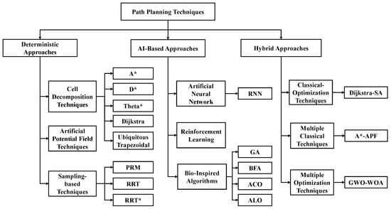 Path planning approaches can be generally classified into three categories: deterministic approaches, artificial intelligence (AI)-based approaches, and hybrid approaches, as shown in Figure 3. There were specific criteria used to classify a given path planning technique into deterministic, AI-based, and hybrid categories. Deterministic approaches involve traditional algorithms that rely on predefined rules and mathematical models. On the other hand, AI-based methods are those techniques that mimic human-like intelligence in solving problems and include the ability to learn from data or experience. Examples of AI-based algorithms can involve artificial neural networks, reinforcement learning, and bio-inspired algorithms. Finally, hybrid approaches combine elements of both deterministic and AI-based techniques, leveraging the strengths of each. Usually, the core of a hybrid technique is a deterministic technique, while an AI approach is integrated to perform some adaptive tuning to some parameters of the deterministic model. The rest of this section shows a brief background for each category and a summary of several studies included in the literature.