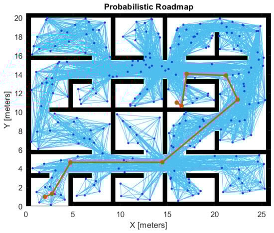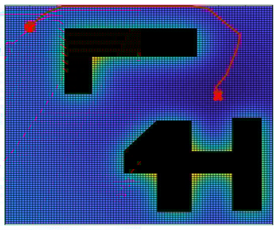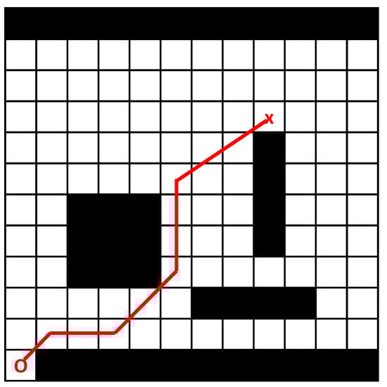 The A* algorithm is a highly favored path planning method that effectively identifies the shortest route between two points on a graph or grid. It is designed to be complete, ensuring it will locate the best solution if it exists. The Dijkstra algorithm, similar to A*, seeks the optimal path within a graph, specifically when the weights of the edges are known. However, unlike the A* algorithm, Dijkstra’s method requires an exhaustive search of the entire graph to find the solution. As a result, A* tends to deliver superior performance in scenarios involving expansive environments. Several works utilized the A* algorithm in finding the optimal path for multi-robot systems [35,36,37,38]. The authors in [35] used the A* path planning technique in order to find the shortest path in an environment with static obstacles only. Additionally, each mobile robot was supposed to reach a different charging point which had a fixed position. On the other hand, there is limited work involving the Dijkstra algorithm obtaining the shortest path. In [41], each mobile robot was supposed to reach its target position while taking into consideration dynamic obstacles using the Dijkstra algorithm. In addition, the robots had to avoid collisions while maintaining the path-priority order. Figure 4 demonstrates an example of finding an obstacle-free path using the A* path planning technique.