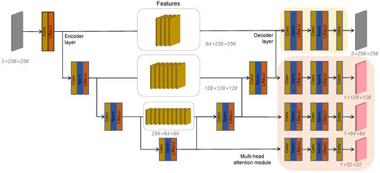 The generator in the modified CycleGAN framework used in this paper employs a standard encoder–decoder network as the generator, which is composed primarily of a deep feature extraction module and an image reconstruction module. This generator is capable of producing high-quality images, including images of optimal resolution with rich detail. The U-shaped discriminator network, as depicted in Figure 6, incorporates a multi-head attention module that performs true–false judgements for different patch sizes. This differs from the conventional approach of improving the global judgement of the generated image over the whole image. This is accomplished by fusing the encoder and decoder output feature maps of varying spatial dimensions and subsequently passing them through distinct convolutional layers, thereby generating a single-channel feature map comprising three distinct resolution patches. The design facilitates the enhancement of accuracy in classification. The regular updating of a generator can better simulate the distribution of real data, thereby generating images with superior quality.