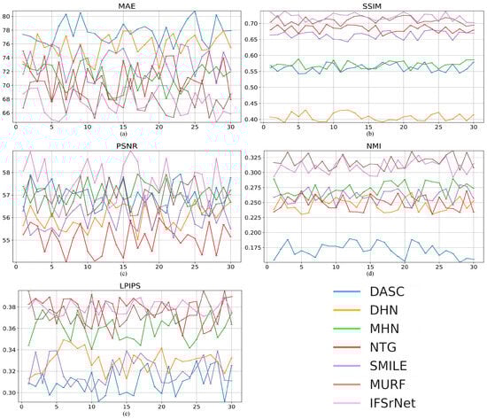 Experimental results on real datasets. Shown in order is the performance in each evaluation metric, (a) MAE, (b) SSIM, (c) PSNR, (d) NMI, and (e) LPIPS. The horizontal axis of the graph represents the number of each sample, while the vertical axis represents the value obtained. The various algorithms have been identified with different colours for differentiation purposes.