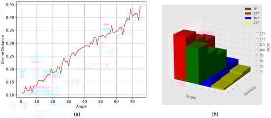 To determine the effect of image training with different rotation angles on the registration network’s performance, three sets of images were randomly selected from the dataset. Each set of images was rotated in 25° intervals from 0° to 75°, resulting in three rotated images per group. Nine new IFS feature matching maps were generated and used to evaluate the algorithm’s robustness under rotated conditions. Simultaneously, the image to be registered was rotated in 1° steps until it was rotated to 75°. The similarity index was calculated as the cosine distance between the rotated image and the reference features. The experimental results are presented in Figure 12a, while Figure 12b shows the number of positive matches (NPM) of the four groups of rotated images.