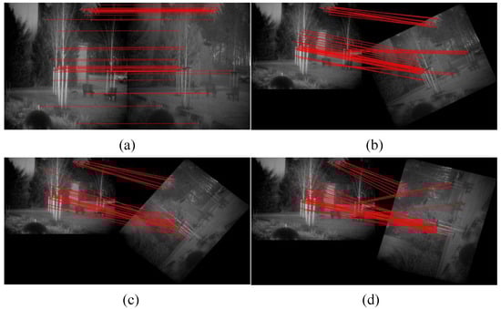 Example of feature matching of two images to be processed, where the left is a reference and the right is a rotated image to be registered. The matching result is shown in (a) with 0° of rotation, (b) shows the result with 25° of rotation, and (c,d) show the results with 50° and 75° of rotation, respectively.
