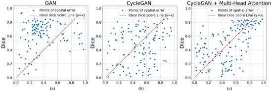 Correlation of estimated spatial errors with Dice in three generation strategies. The distribution of spatial error points in (a,b) does not exhibit a strong positive correlation with the Dice coefficient. In contrast, the generative model employed in this study, as illustrated in (c), exhibits a clear positive correlation.