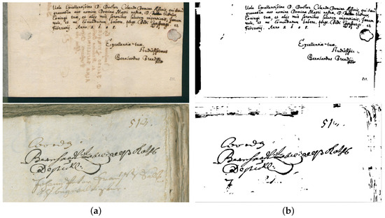 - Tensmeyer, C.; Martinez, T. Document image binarization with fully convolutional neural networks. In Proceedings of the 2017 14th IAPR International Conference on Document Analysis and Recognition (ICDAR), Kyoto, Japan, 9–15 November 2017; Volume 1, pp. 99–104. [Google Scholar]