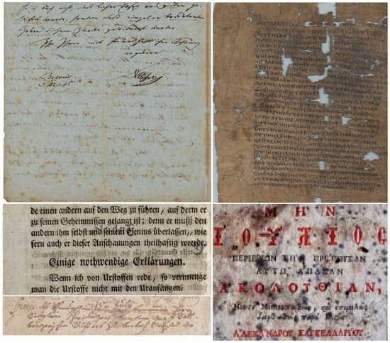 - Pratikakis, I.; Zagoris, K.; Barlas, G.; Gatos, B. ICFHR2016 Handwritten Document Image Binarization Contest (H-DIBCO 2016). In Proceedings of the 2016 15th International Conference on Frontiers in Handwriting Recognition (ICFHR), Shenzhen, China, 23–26 October 2016; pp. 619–623. [Google Scholar] [CrossRef]