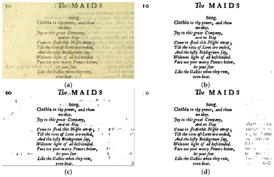 - Jiang, L.; Chen, K.; Yan, S.; Zhou, Y.; Guan, H. Adaptive Binarization for Degraded Document Images. In Proceedings of the 2009 International Conference on Information Engineering and Computer Science, Wuhan, China, 19–20 December 2009; pp. 1–4. [Google Scholar] [CrossRef]