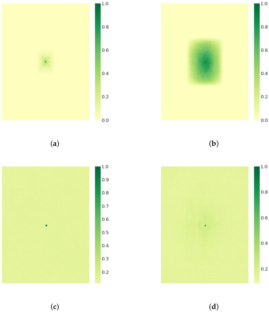 Comparison of receptive field effects of RestNet and Transformer before and after training for the central element. The transition from light yellow to dark green signifies the increased influence of the receptive field region on the central element. (a) Receptive field before training for RestNet. (b) Receptive fields after RestNet training. (c) Receptive field before training for Transformer. (d) Receptive Fields after Transformer training.