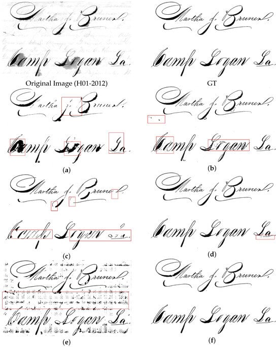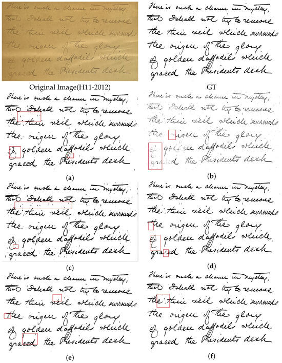 Comparison of image H11-2012, its GT, and the results obtained by different binarization methods. Some differences between the binarized results and GT are highlighted using red boxes. Binarization results of (a) Xiong et al. [46], (b) Sauvola [22], (c) Calvo and Gallego [19], (d) Rezanezhad et al. [63], (e) Biswas et al. [72], and (f) the proposed method.