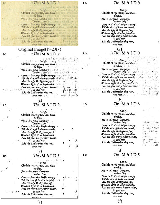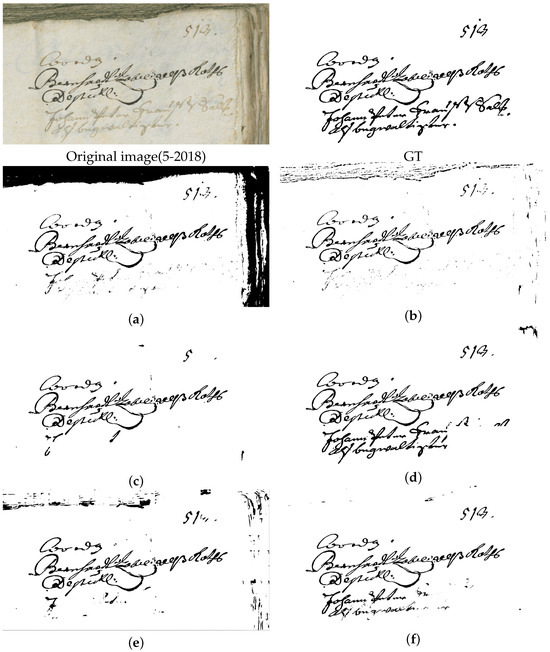 Image 5-2018, its GT, and a comparison of the results obtained by different binarization methods. Binarization results of (a) Otsu [20], (b) Sauvola [22], (c) Xiong et al. [46], (d) Rezanezhad et al. [63], (e) Calvo and Gallego [19], and (f) the proposed method.
