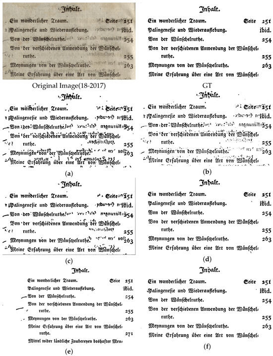 The experiments conducted for this paper involve a meticulous comparison and analysis across three prominent datasets: DIBCO2012 [11], DIBCO2017 [15], and DIBCO2018 [16]. We compare the document image binarization model proposed in this paper with deep-learning-based models [49,59,63,64,69,72,83] and the classic traditional method [20,22,46] for three datasets [11,15,16]. By enumerating the visual comparison maps of the binarization results and calculating the relevant evaluation indicators, a comparative analysis is carried out. Visual comparisons of the performance of various methods on distinct datasets are presented in Figure 7, Figure 8, Figure 9, Figure 10, Figure 11 and Figure 12. These visualizations serve as a cornerstone for our comparative analysis and facilitate an intuitive understanding of methodological efficacy.