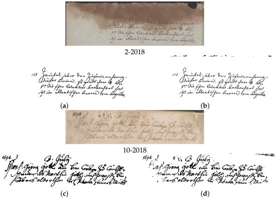In recent years, the achievements in document image binarization research have primarily been realized through deep learning [19,47,48,49,50,51,52,53,54,55,56,57,58,59,60,61,62,63,64,65,66,67,68,69,70,71,72]. Neural networks have demonstrated remarkable ability to segment foreground text and the backgrounds of document images, as demonstrated by a comparison of a deep learning algorithm [63] with the traditional method [46] (winner of DIBCO2018) for the binarization of handwritten document images, as shown in Figure 3.