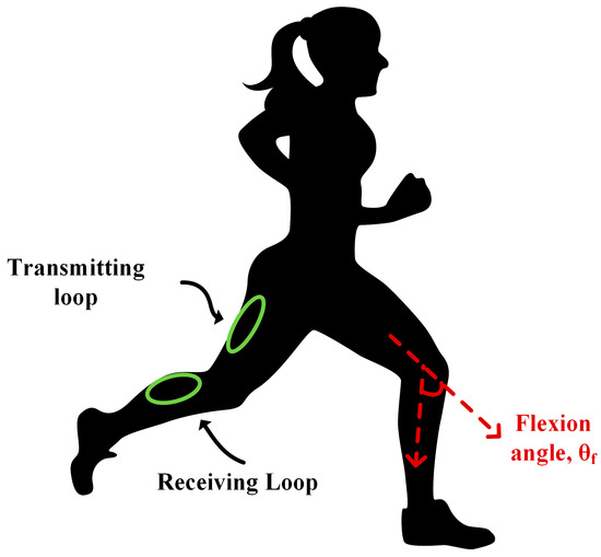 To overcome these limitations, we recently reported an alternative solution based on electrically small loop antennas (hereafter referred to as loops) that are placed above and below the joint, respectively, hence misaligning as the joint moves, Figure 1 [23,24]. In brief, the loop above the joint transmits electromagnetic (EM) energy in the inductive regime, while the loop below the joint receives energy and generates voltage based on Faraday’s law. A mapping process is then pursued to map the transmission coefficient (|S21|) values into joint angles. Note that the setup of Figure 1 is suitable for joint flexion monitoring and that a second receiving loop can be added to monitor joint rotation as well [23].