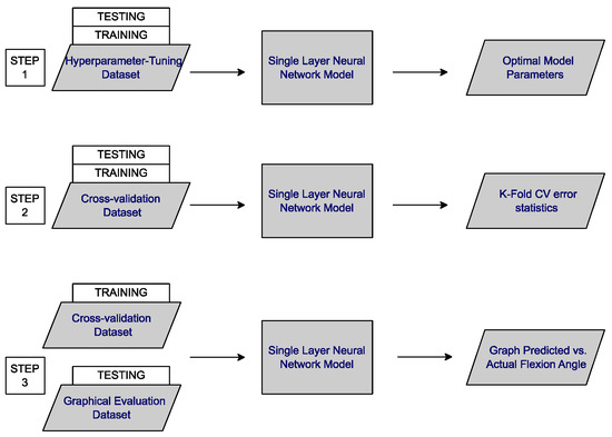Then, we apply three machine learning steps. These are visualized in Figure 3. First, we use the hyperparameter-tuning dataset to grid search for the optimal hyperparameters for the neural network model (Figure 3, step 1). This model, with these hyperparameters, is used for the remaining experiments. Then, we use the cross-validation dataset to perform a 5-Fold Cross Validation (CV)—evaluating model performance and testing for overfitting (Figure 3, step 2). We want to ensure that this model is accurate for all data, not just a specific subset of the data. Then, we train the model on the entire cross-validation dataset and test on the graphical evaluation dataset (Figure 3, step 3). We use these predictions to graph the model’s predicted vs. actual angle values.