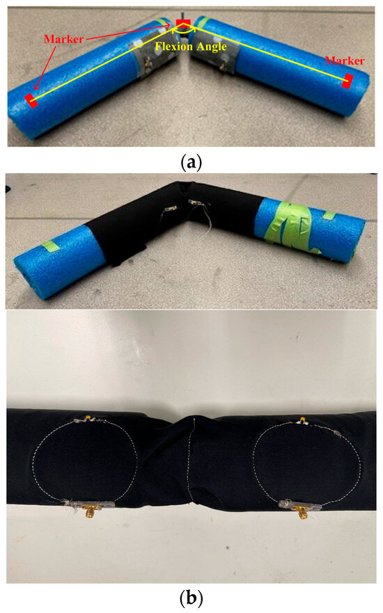 To mimic flexion of the knee joint, a Styrofoam leg phantom was used. Without loss of generality, this particular phantom allows for sagittal plane flexion between 0.46° and 122.79°, per the definition in Figure 4a. Figure 4a shows the definition of the sagittal flexion angle, by identifying the location of the utilized measurement markers. Note that since loops are operated in the inductive regime, their operation is insensitive to the presence or absence of tissue [23]. The phantom was made of two Styrofoam cylinders with radius 4 cm and length 38 cm. A 3D-printed joint was attached to both cylinders so that they could move analogously to a human joint. The cylinders were subsequently glued onto the 3D-printed fixture in order to prevent rotation which would obfuscate measurements. On the center of the joint and the ends of both cylinders, small strips of reflective tape were placed so that “gold-standard” angles could be detected using camera-based methods.
