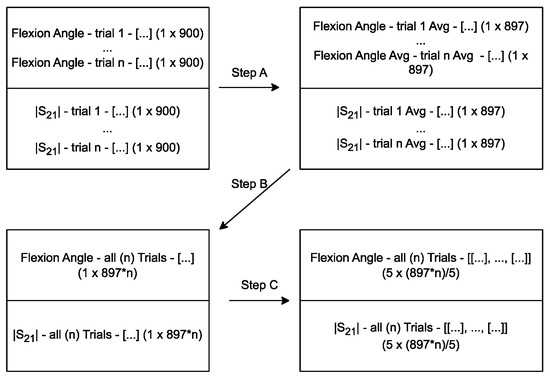 Let us consider n as the number of trials we record and 900 as the number of (|S21|, flexion angle) pairs we record per trial. First, a moving average with window size of 5 was applied to the |S21| coefficient and flexion angle vectors for each trial. This was carried out to reduce noise in the |S21| data so that the ANN can make more accurate predictions of flexion angle, based only on input |S21| data from wearable loops on the phantom arm (Step A in Figure 5). This window size was chosen after comparing the training error for the same basic model and several different window sizes. Specifically, during our training process, we tested input vectors where a moving average was both applied and not applied. Performance was maximized with a moving average (window size = 5). This is true, as the moving average lessens the impacts of noisy points that are significantly different from other points around them with respect to time. Then, after applying the moving average, we have 896 pairs per trial. Keeping all data in order with respect to time, we create two (1 row × n × 896 column) vectors, each representing all |S21| and all flexion angle data (Step B in Figure 5). Next, we create two reshaped matrices (also representing all |S21| data, all flexion angle data) from the previous (1 × n × 896 column) vectors. Every five consecutive elements in each previous vector become an element in the new corresponding matrix. Then, each matrix is sized (5 × (896 × n)/5) (Step C in Figure 5).