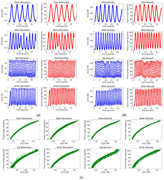 For example, Figure 6 shows (|S21|, flexion angle) data points as recorded with respect to time, for sleeveless (a) and sleeved (b) trials. Then, vectors from (c) are in the matrices described above. We utilize three sets of data throughout this work. First, we select one trial from each defined category, such as in Figure 6c. Then, for each trial, we follow the data preprocessing steps in Figure 5, with the exception that we keep trials separated and data points sequential in time order. Then, this forms the graphical evaluation dataset. Next, with the remaining data, we follow the steps in Figure 5. We then split these matrices in an 80/20 ratio: 80% of the vector pairs are used as the cross-validation dataset, while 20% of the vector pairs are used as the hyperparameter tuning dataset (both seen as input datasets in Figure 3).