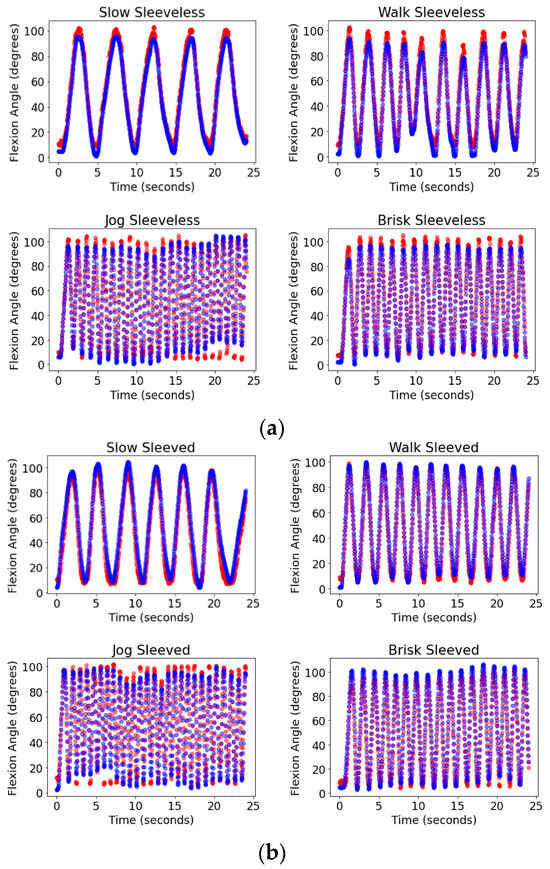 Predicted (blue) vs. actual (red) angles as a function of time for all speeds: (a) sleeveless sensor and (b) sleeved sensor.