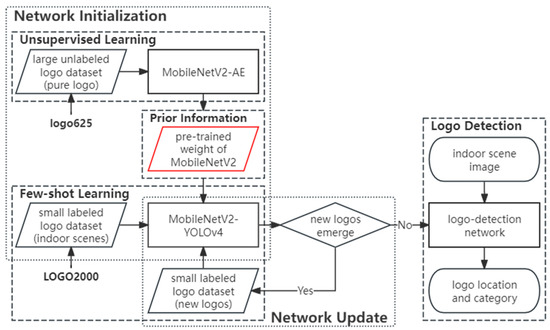 Based on the above analysis, in this work, we propose a deep-learning-based logo-detection framework that combines few-shot fine-tuning and unsupervised learning. Considering the need for real-time performance and the existing limits of computation in engineering applications, we opt for a lightweight backbone network and a one-stage object-detection architecture. We utilize the autoencoder to carry out unsupervised pre-training (UP) on a large unlabeled logo dataset. This allows us to acquire valuable prior knowledge of logos, which we can then transfer to the logo-detection network for efficient few-shot fine-tuning. In our method, the UP technique is constant for all indoor scenes and needs to be performed only once. If logos change or new categories of logos are introduced, only a few-shot fine-tuning is required for updates. We conducted experiments on a logo dataset based on self-collected indoor-scene images. We compared the results with three baseline methods and demonstrated the effectiveness of our approach. In particular, we confirmed the efficiency of our UP technique through ablation experiments.