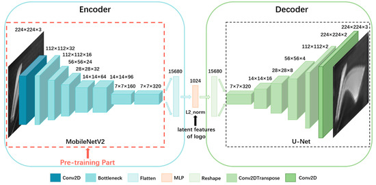 Our MobileNetV2 autoencoder structure is shown in Figure 2, where the input image is first resized to 224 × 224 and then encoded by the MobileNetV2 to obtain a 1024-dimensional latent feature. The latent feature vector is then input into the decoder to reconstruct the image, and the encoder’s capability to extract logo latent features is improved by minimizing the difference between the reconstructed image and the original image (Equation (4)).
