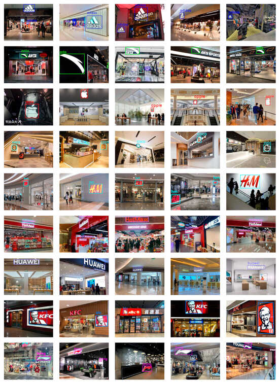 Example images of LOGO2000. First, we created a color dictionary, assigning a different box color to each category. Then, we extracted the coordinates of the top-left and bottom-right corners of the bounding boxes and the label names from each image’s corresponding label. We used OpenCV to draw the tilted bounding boxes.