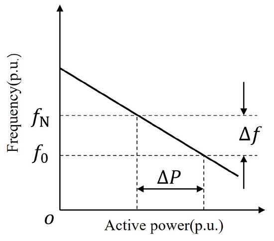 Droop control is a steady-state support process that is mainly used to reduce the frequency deviation of the system and can simulate the differential adjustment process of the synchronous generator’s primary frequency regulation, which is conducive to maintaining the stability of the system frequency. The root cause of the frequency fluctuation of the power system is the mismatch of power, that is, the mismatch between the active power and the load power of the generator. When the active power output of the system power supply is missing or increasing, the system frequency will decrease or increase. The traditional synchronous generator set can respond to the change in system frequency; the governor controls the speed down or up and changes the output power of the synchronous machine so that the power in the system gradually reaches a new equilibrium state. A typical droop control is shown in Figure 1.
