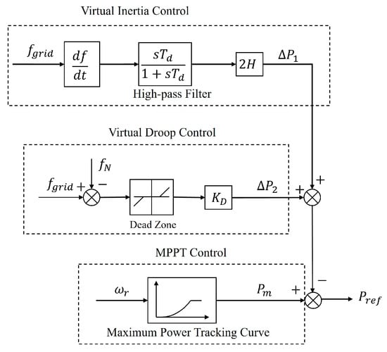 The principle of comprehensive inertia control is shown in Figure 2. The comprehensive inertia control obtains the compensation power and according to the frequency change rate and frequency deviation, respectively, which determines the reference value of active power together with the output power controlled by wind power MPPT and then participates in the frequency adjustment of the system. The addition of droop control can avoid the secondary drop in the frequency and improve the stability of the system frequency. The function of the high-pass filter is to prevent the virtual inertia control from working in the steady state of the system and only acting on the frequency change rate [].