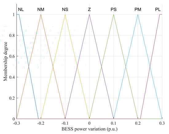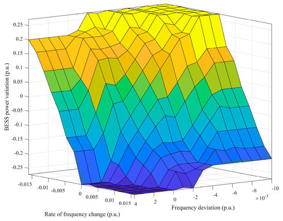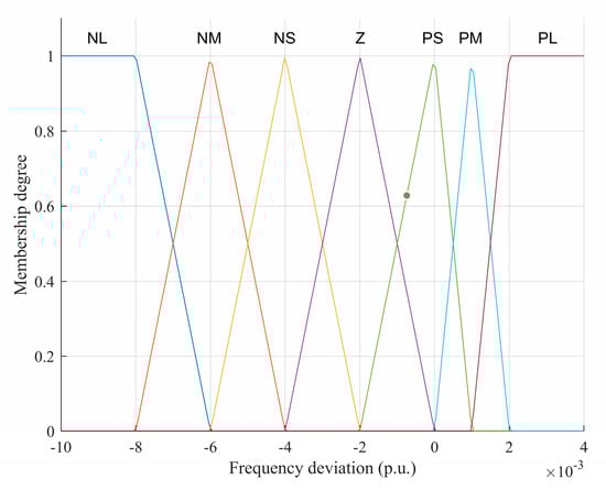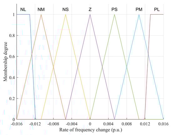The structure of the fuzzy logic controller is shown in Figure 5. The input of the fuzzy logic controller designed in this study is the frequency deviation and frequency change rate of the AC system , where the values range from −0.01 to 0.004 p.u. and −0.016 to 0.016 p.u. Because the frequency deviation of high frequency is smaller than that of low frequency in practical engineering applications, the upper limit of the frequency deviation is smaller than the lower limit. The output is the change in the active power of the BESS (battery storage energy) , and the value ranges from −0.3 to 0.3 p.u.