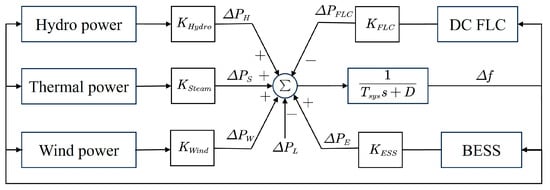 In the model, is the inertia corresponding time constant of the system; is the frequency regulation power for the hydro power; is the frequency regulation power for the thermal power; is frequency regulation power for wind power; is the frequency regulation power for FLC; is the frequency regulation power for BESS ; , , , , are proportional gains.